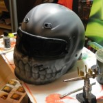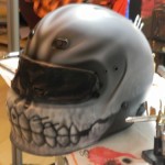 Der Kunde wollte einen grinsenden Helm mit den Farben Schwarz und Orange. Die Fliege, die durch den Vorderzahn kracht und dann hinten raus fliegt, war eine Idee von mir, die der Kunde ganz begeistert aufgenommen hat ...
